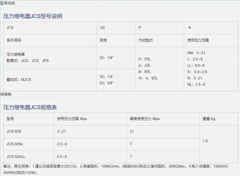 壓力繼電器JC-JCS有如下型號:JC-JCS-02-1 JC-JCS-02-N-1 JC-JCS-02-NL-1 JC-JCS-02-NLL-1